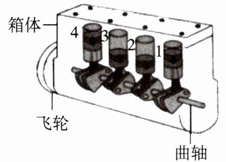 11. 下图为四缸发动机示意图,其工作原理为:四个气缸的活塞连在一根曲轴上,各气缸的做功过程错开,在飞轮转动的每半周里,都有一个气缸在做功,其他三个气缸分别在做吸气、压缩和排气工作。有一台四缸发动机,其主要技术指标如下表所示。其中排量等于四个气缸工作容积的总和,气缸工作容积指活塞从气缸顶部到底部所扫过的容积,又称单缸排量,它取决于活塞的面积和活塞上下运动的距离(即冲程长)。转速的数值为每分钟曲轴或飞轮所转的周数。回答下列问题。