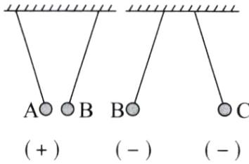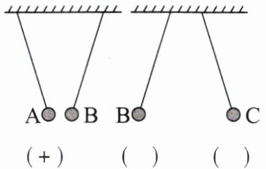 2. 正、负电荷是如何规定的?图中A、B、C三个轻质小球都带了电,它们靠近时的相互作用情况如图所示,A小球的带电情况已标出,请你在相应的括号中用“+”或“-”标出B与C小球的带电情况。