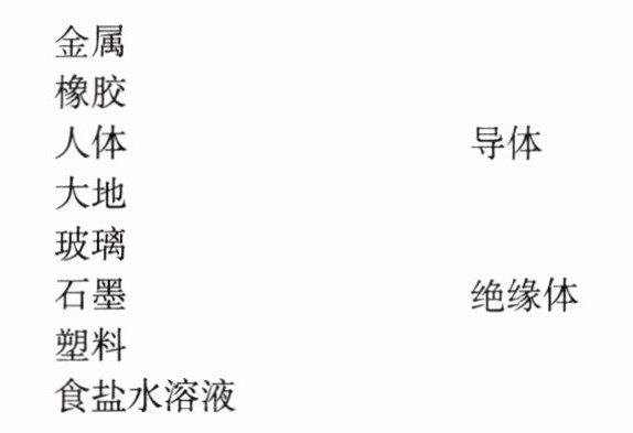 1.容易导电的物体叫作导体;不容易导电的物体叫作绝缘体。2.金属 橡胶 人体 导体 大地 玻璃 绝缘体 石墨 塑料 食盐水溶液