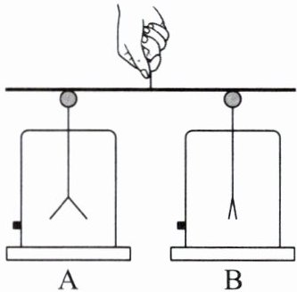 如图所示,有两个相同的验电器,其中A带正电、B不带电。用带有绝缘柄的金属棒把A和B连接起来。下列说法错误的是(