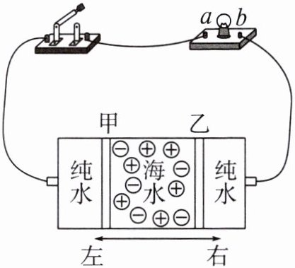 7. 如图所示,图中有一种利用海水盐差能发电的装置,甲、乙两块渗透膜将容器隔成三个区域,分别加入海水和纯水。微粒在永不停息地做无规则运动,甲渗透膜只能让带正电的钠离子通过,乙渗透膜只能让带负电的氯离子通过,容器就变成了电源,把小灯泡接进电路,闭合开关,小灯泡可发光。下列说法正确的是(