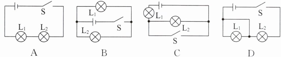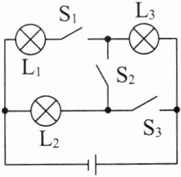 D 解析 只闭合开关S₁时,电流从电源正极流出后,依次通过L₃→S₁→L₁后回到电源负极,所以灯泡L₁、L₃串联,A错误。只闭合开关S₂时,电流从电源正极流出后,依次通过L₃→S₂→L₂后回到电源负极,所以灯泡L₂、L₃串联,B错误。只闭合开关S₂、S₃时,L₃被短路,只有L₂接入电路,C错误。闭合所有开关时,L₃被短路,电流从电源正极流出后分成两支,一支通过L₂,另一支通过L₁,所以灯泡L₁、L₂并联,D正确。