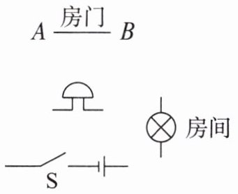 如图所示,某学校物理创新实验小组的同学要设计一个自动防盗报警电路。要求:晚间开关 $ S $ 闭合后,灯亮电铃不响;当房门被打开时,细导线 $ AB $ 被扯断,灯亮且电铃发声自动报警。请按要求用直线连接如图所示的电路元件。