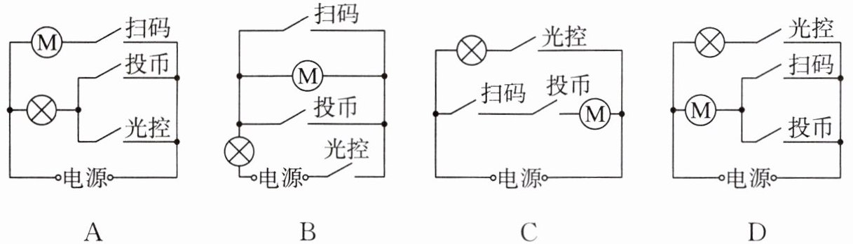 D 解析 由题意知,自动出售服务既可以通过扫码闭合开关,也可以通过投币闭合开关,这说明扫码和投币互不影响,由此可推知扫码开关和投币开关应是并联的,两个开关都能控制电动机;光线较暗时光控开关自动闭合,接通灯泡提供照明,这说明灯泡能独立工作,故灯泡与电动机是并联的。综上分析,D符合题意。