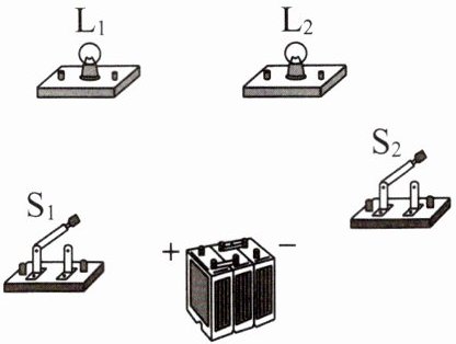 (选填“$ L_1 $ 灯丝断了”“$ L_2 $ 灯丝断了”“$ L_1 $ 短路”或“$ L_2 $ 与灯座接触不良”)。(3)排除故障后,闭合开关,两灯同时亮,断开开关,两灯同时灭;将开关 $ S $ 分别换接到 $ L_1 $ 和 $ L_2 $ 之间、$ L_1 $ 和电池正极之间,观察到同样的现象。这样操作的目的是探究