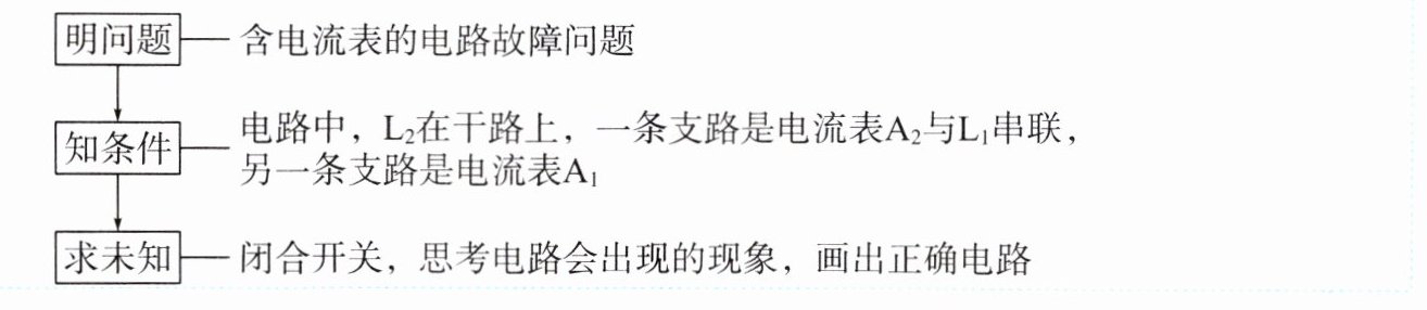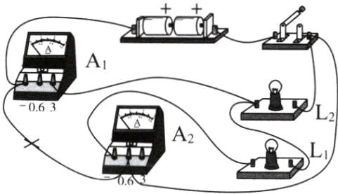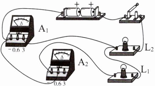 解析 由实物电路知,电流表$A_{2}$与$L_{1}$串联,且$A_{2}$接线柱接反;电流表$A_{1}$与电流表$A_{2}$和$L_{1}$所在支路并联。闭合开关后,电流从电流表$A_{1}$流回电源的负极,电流表$A_{2}$与$L_{1}$串联的支路被短路,灯泡$L_{1}$不发光,电流表$A_{1}$有示数。电流表接入电路中时要求电流“+”进“−”出,要想电路成为正确电路,需删除连接电流表$A_{2}$的“0.6”接线柱上的导线,并将开关右端接线柱与电流表$A_{2}$的“0.6”接线柱用导线连接起来。