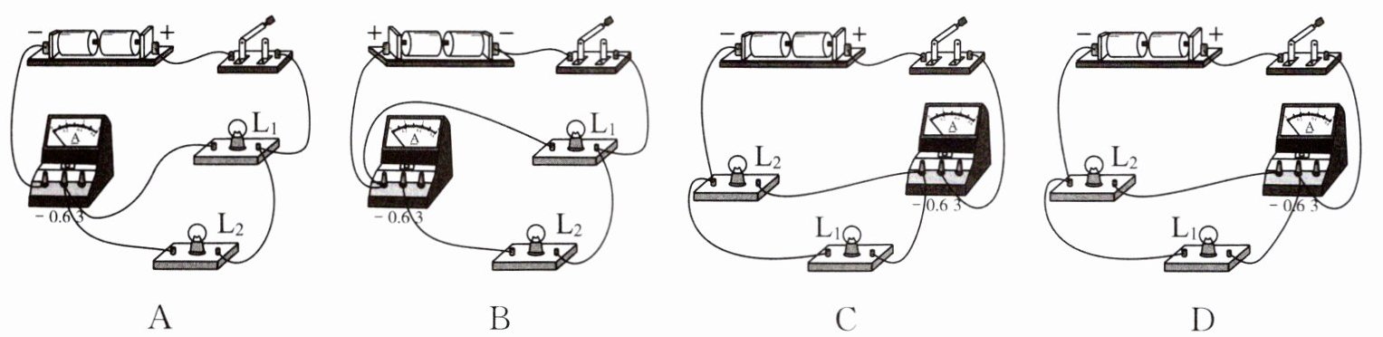 D 解析 A、C两图中,去掉电流表,整个电路均与电源断开,由此可知电流表串联在干路中,测量干路中的电流,A、C不符合题意。B图中,去掉电流表,灯$L_{2}$不能工作,说明电流表与$L_{2}$串联,但电流表的正负接线柱接反了,不能测出通过灯$L_{2}$的电流,B不符合题意。D图中,电流表与灯$L_{2}$串联,电流从标识“+”号接线柱流进,再从标识“−”号接线柱流出,可以测出灯$L_{2}$的电流,D符合题意。