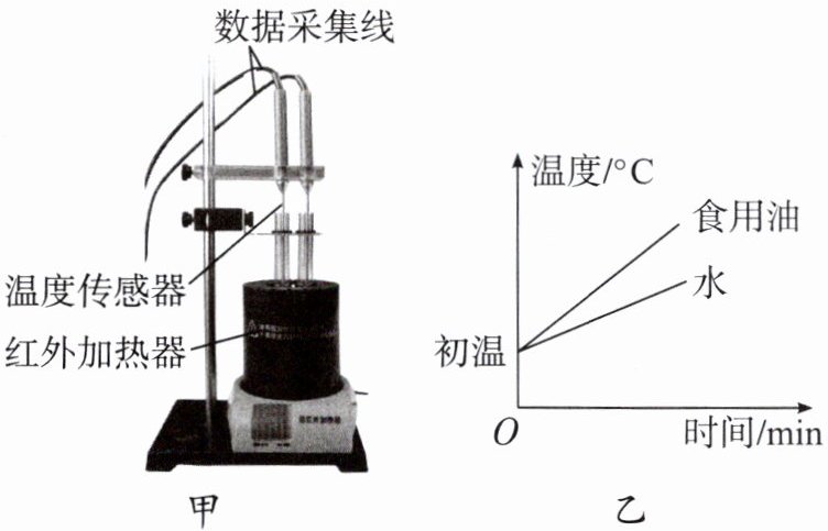 、初温相同的水和食用油。(2)将两支相同的温度计分别正确地插入盛有水和食用油的两个试管内,并将实验装置固定在铁架台上,如图甲所示。打开加热开关,对盛有水和食用油的试管进行加热,实验中通过