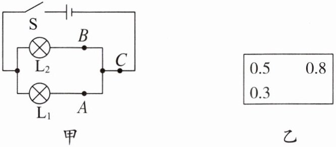 6. 图甲是小李同学探究并联电路的电流规律时使用的电路图。实验中他用电流表分别测出A、B、C三处的电流$I_{A}$、$I_{B}$、$I_{C}$,但他没有及时将数据整理到相应表格中而是随手记录到了草稿纸上,如图乙所示。已知通过$L_{1}的电流小于通过L_{2}$的电流,则$I_{A} = $