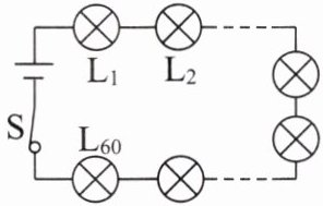5. 晚上我们在街头看到的“满天星”是由一串串小彩灯组成的。下图是一串小彩灯的电路示意图,共有60只相同的小彩灯串联,若通过灯$L_{1}$的电流是0.15 A,则电路中的电流是