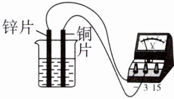 2. 在烧杯中加入盐水,将铜片和锌片放在盐水中,这就是一个电池。用电压表测量这个自制电池的电压,其现象如图所示。下列说法正确的是(