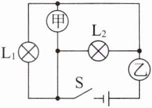 B 解析若甲是电流表、乙是电压表,或甲、乙都是电压表,则电压表串联在电路中,电路中电流几乎为0,灯泡$L_{1}$、$L_{2}$均不发光,A、D不符合题意。若甲是电压表,乙是电流表,则电流分别经灯泡$L_{1}$和$L_{2}$回到负极,$L_{1}$、$L_{2}$ 并联,都能发光,B符合题意。若甲、乙都是电流表,会造成电源短路,C不符合题意。