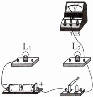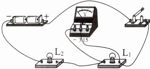 8. (2024·贵州中考)下图是未完成连接的实物电路,请在图中用笔画线表示导线按要求完成电路连接。要求:两灯串联,电压表测量小灯泡$L_{2}$两端电压,导线不能交叉。