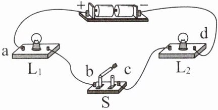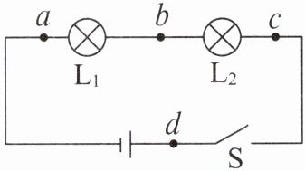 3. 右图为小明连接的电路,他先确认导线连接无误后,闭合开关 $ S $,发现两灯均不发光。于是他将一个电压表分别接到接线柱 $ a $、$ b $,$ b $、$ c $,$ a $、$ c $ 上,灯 $ L_1 $、$ L_2 $ 均不发光,且电压表无示数;再将电压表接到接线柱 $ d $、$ c $ 上,灯 $ L_1 $、$ L_2 $ 均不发光,但电压表指针有明显偏转。由此判定电路的故障可能是(