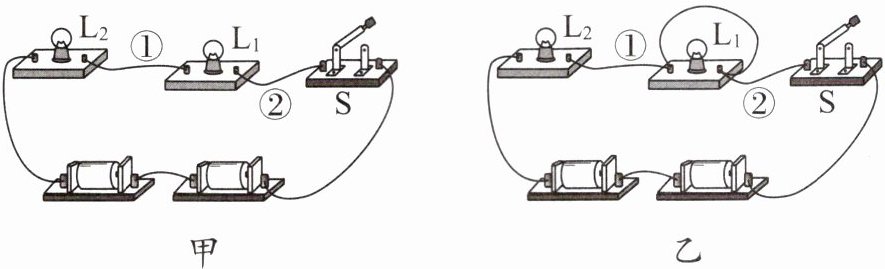 1. 小华连接了如图甲所示的电路,闭合开关 $ S $ 后,发现灯泡 $ L_1 $、$ L_2 $ 均不发光,为了排除电路故障,他用一根导线进行检查判断。他先将导线并联在灯泡 $ L_2 $ 两端的接线柱上,闭合开关后,发现灯泡 $ L_1 $、$ L_2 $ 均不发光;然后他将导线并联在灯泡 $ L_1 $ 两端的接线柱上,如图乙所示,闭合开关 $ S $ 后,发现灯泡 $ L_1 $ 不发光、$ L_2 $ 发光,下列判断中正确的是(