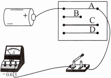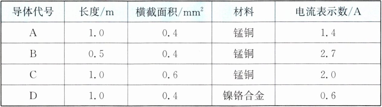 某学习小组在探究影响导体电阻大小的因素时,设计了如图所示的实验装置,实验中分别将 A、B、C、D 四根导体接入电路,四根导体的材料规格如表所示。
