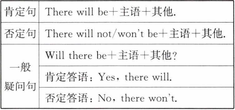 剖析 there will be 意为“将有;会有”,是 there be 句型的一般将来时形式,其句式结构如下: