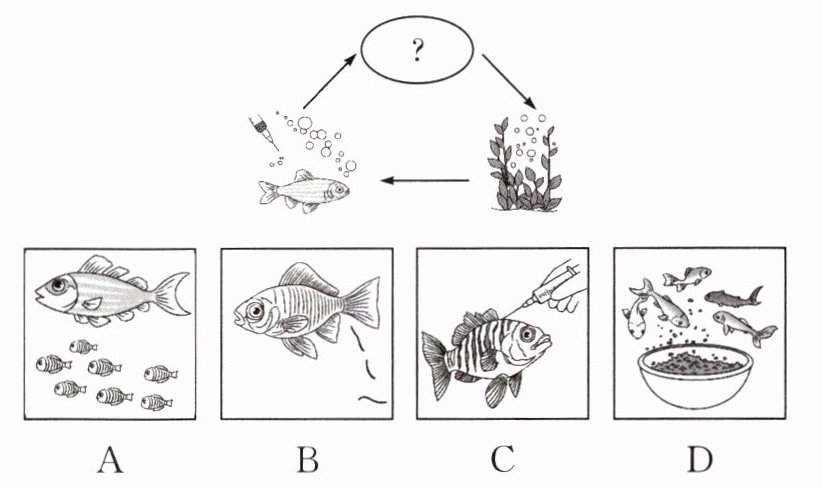 2. Which picture should be in the circle to show the ecosystem in the fish tank?