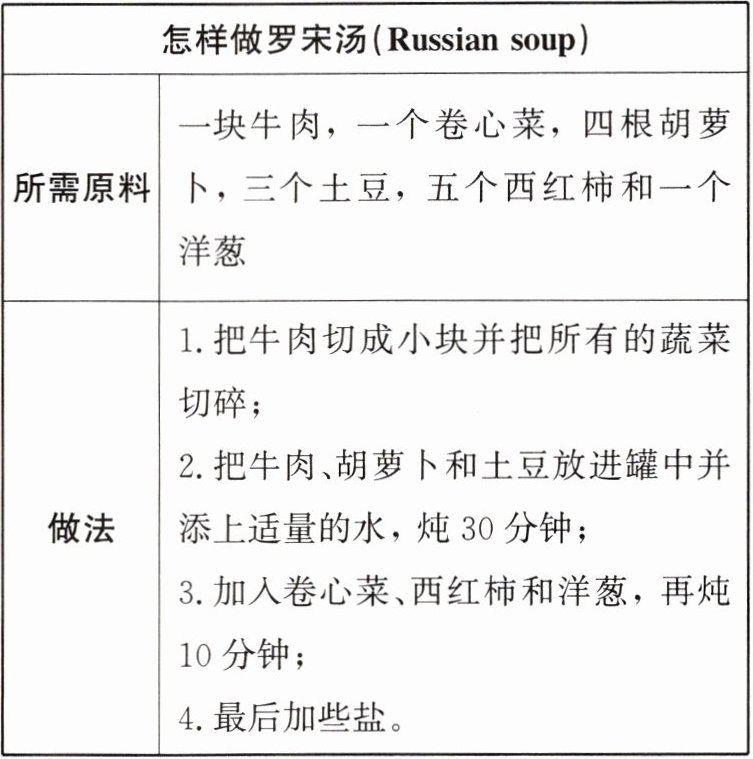 根据下面的表格提示写一篇英语短文,介绍一下罗宋汤的做法,不少于 80 词,可适当发挥。