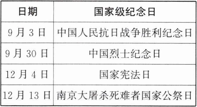 日期国家级纪念日9月3日中国人民抗日战争胜利纪念日9月30日中国烈士纪念日12月4日国家宪法日12月13日南京大屠杀死难者国家公祭日