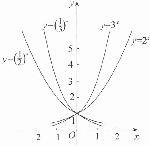 情境:观察在同一平面直角坐标系中函数 $ y = 2^x $,$ y = 3^x $,$ y = (\frac{1}{2})^x $,$ y = (\frac{1}{3})^x $ 的图象.