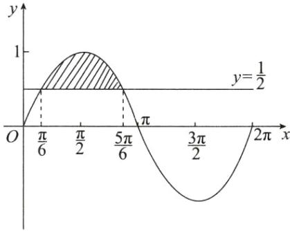 所以当$0\leq x\leq2\pi$时,$\sin x\geq\frac{1}{2}$的解为$\frac{\pi}{6}\leq x\leq\frac{5\pi}{6}$,