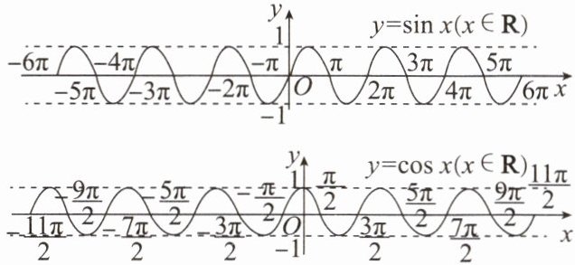 (3)当自变量 $ x $ 的值增加 $ 2\pi $ 的整数倍时,函数值重复出现,怎样描述正弦函数、余弦函数图象具有的这种性质?