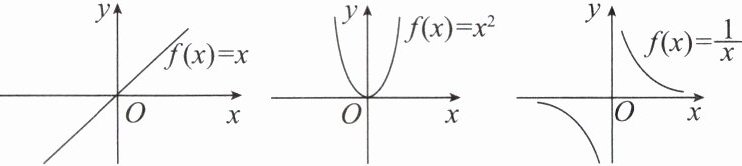 情境Ⅱ:作出函数 $ f(x) = x $,$ f(x) = x^2 $,$ f(x) = \frac{1}{x} $ 的图象,如图所示。