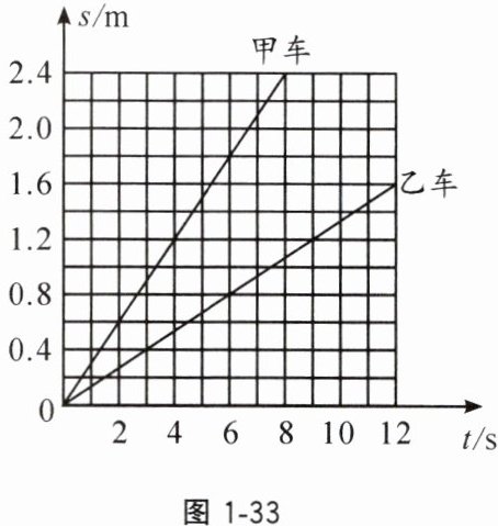 9. 甲、乙两辆小车同时从同地出发向东做匀速直线运动,它们通过的路程s和运动时间t的关系图像如图1-33所示。由图像可知(