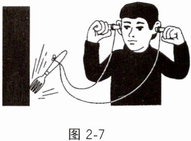 9. 如图2-7所示,将一把金属叉子拴在一根约1m长的线的中间,把线的两端分别紧密缠绕在双手的食指上,并插入耳朵;然后让叉子撞到坚硬的物体上,等它垂下把线拉直时,你就可以听到敲钟似的响声。通过撞击,金属叉子