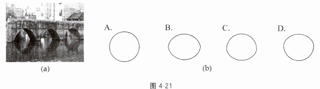 3. 如图4-21(a)所示,平静的水面上有一座石桥,桥孔看上去是圆形的。当水面上升时,看到桥孔的形状是图(b)中的(