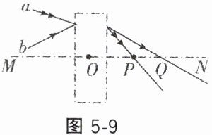 5. 如图5-9所示,虚线框内为一透镜,MN为透镜的主光轴,O是透镜光心,a和b是射向透镜的两条光线。已知光线a通过透镜之后与MN交于P点,光线b通过透镜之后与MN交于Q点。由图可知,下列说法中正确的是(