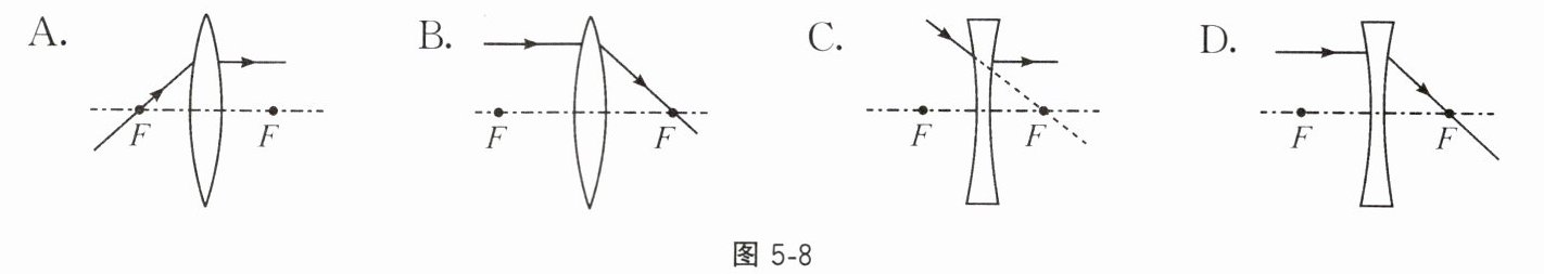 4. 如图5-8所示是一条光线通过透镜的光路图,其中哪幅图的光路是错误的?(