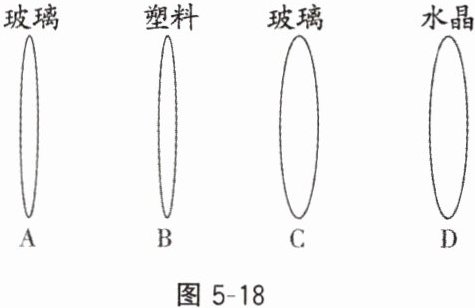 10. 某物理学习小组选择如图5-18所示的四个透镜进行探究实验(其中A、B和C、D是两组形状相同的凸透镜,它们分别用玻璃、塑料、玻璃和水晶制作而成):