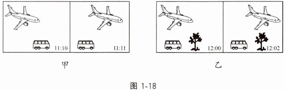 14. 观察不同时刻拍摄的甲、乙两组照片(图1-18),其中能判断是飞机还是汽车在运动的是