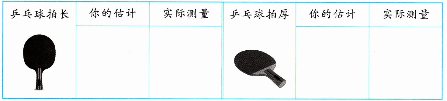 | 乒乓球拍长 | 你的估计 | 实际测量 | 乒乓球拍厚 | 你的估计 | 实际测量 |