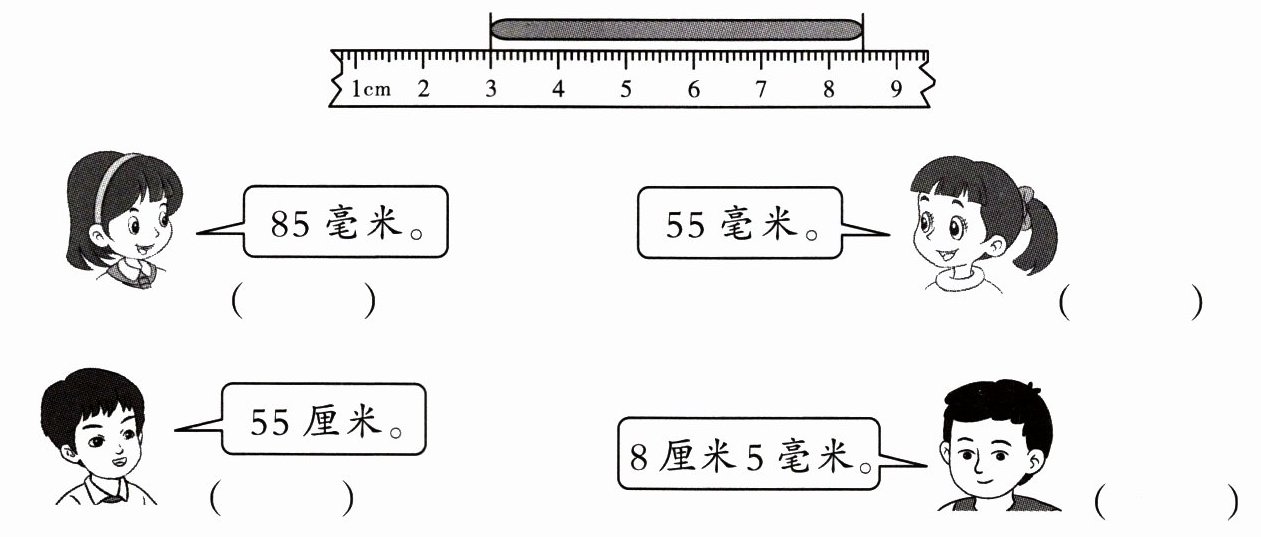 4. 同学们用一根断尺测量小棒,关于小棒的长度,谁说得对?请画“√”。