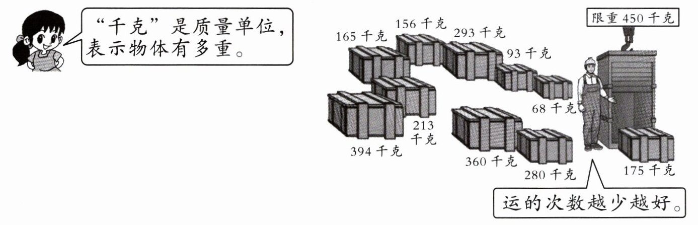 175千克和213千克运一次,394千克运一次,156千克和293千克运一次,68千克和360千克运一次,165千克和93千克运一次,280千克运一次,运6次可以把货物全部运完。(答案不唯一)