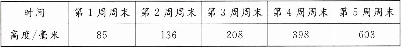 (2)398-208=190(毫米) 603-398=205(毫米) 205-190=15(毫米) 第5周生长得快。多生长了15毫米。