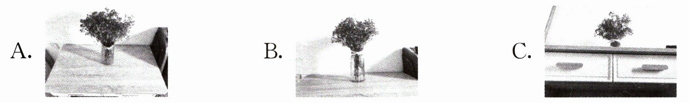 2. 妈妈在书桌上放了一瓶插花,小花猫站在地上抬头看,看到的是( )。