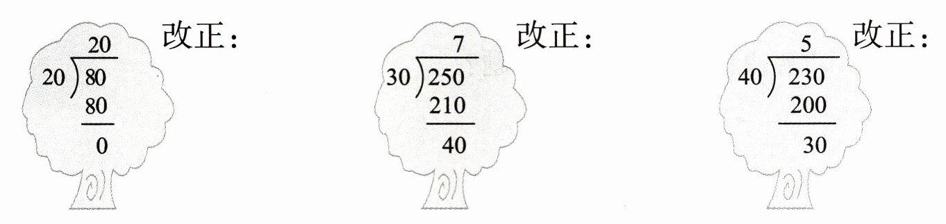 $\begin{array}{r} 20\\ 20\enclose{longdiv} {80}\\ 80\\ \hline 0\end{array} $改正: $\begin{array}{r} 7\\ 30\enclose{longdiv} {250}\\ 210\\ \hline 40\end{array} $改正: $\begin{array}{r} 5\\ 40\enclose{longdiv} {230}\\ 200\\ \hline 30\end{array} $改正: