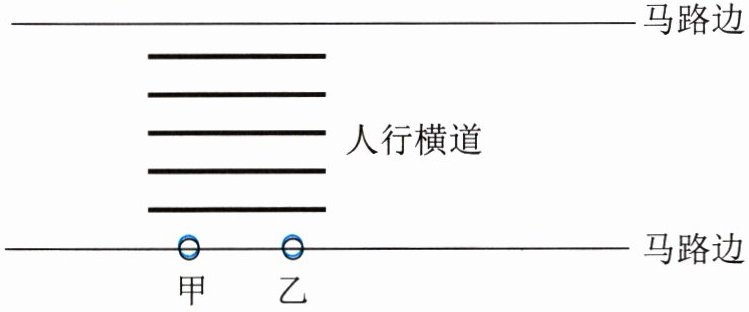 (2)如果甲、乙两人要过马路,请你画出他们行走的最短路线。你这样画的数学依据是:点到直线之间( )最短。