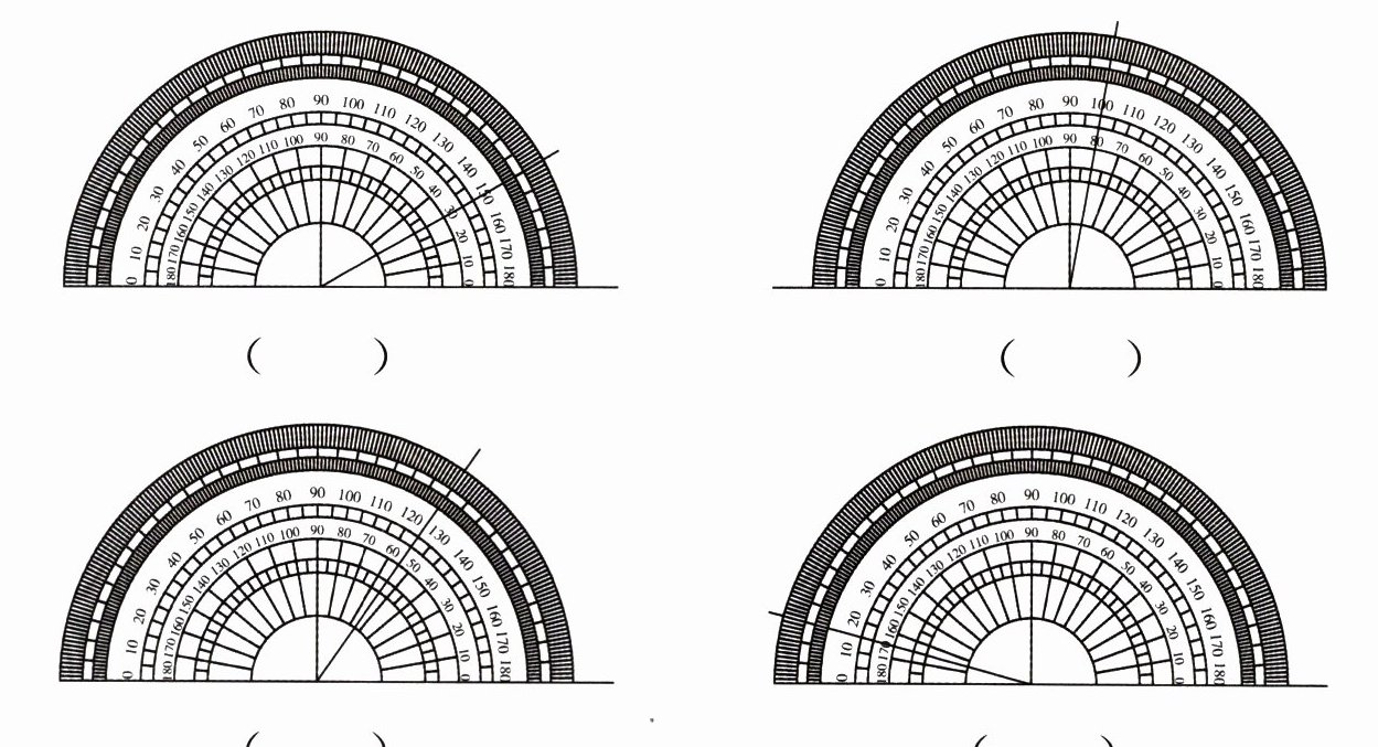 (2)度量角的大小可以用量角器,它把一个半圆平均分成( )份。在量角器上,最大的角是( )。