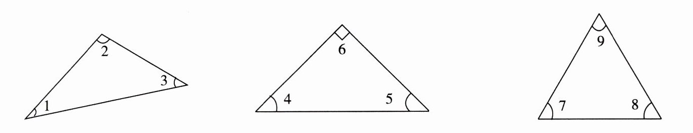$\angle 1+\angle 2+\angle 3 = (\quad)^{\circ}$ $\angle 4+\angle 5+\angle 6 = (\quad)^{\circ}$ $\angle 7+\angle 8+\angle 9 = (\quad)^{\circ}$