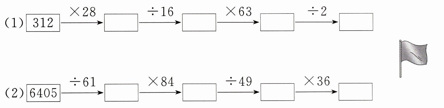 (1)$\boxed{312}\xrightarrow{×28}□\xrightarrow{÷16}□\xrightarrow{×63}□\xrightarrow{÷2}□$