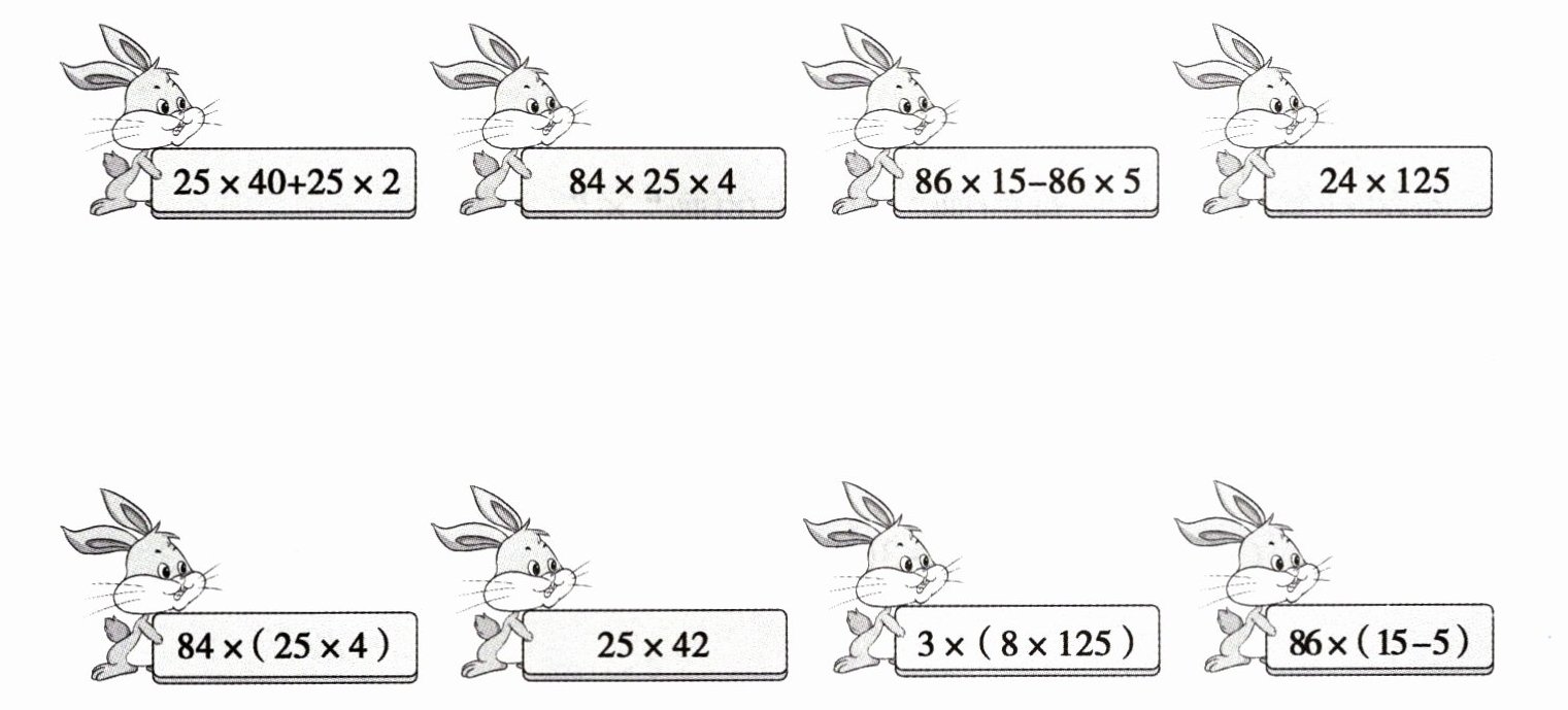 $25×40+25×2$连$25×42$;$84×25×4$连$84×(25×4)$;$86×15-86×5$连$86×(15-5)$;$24×125$连$3×(8×125)$