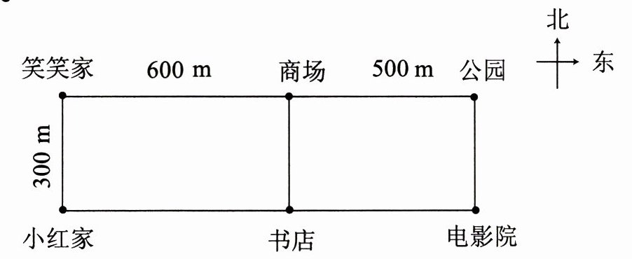 (1)笑笑准备去看电影,她从家出发,先向______走______m,经过______,再向______走______m,到达电影院。