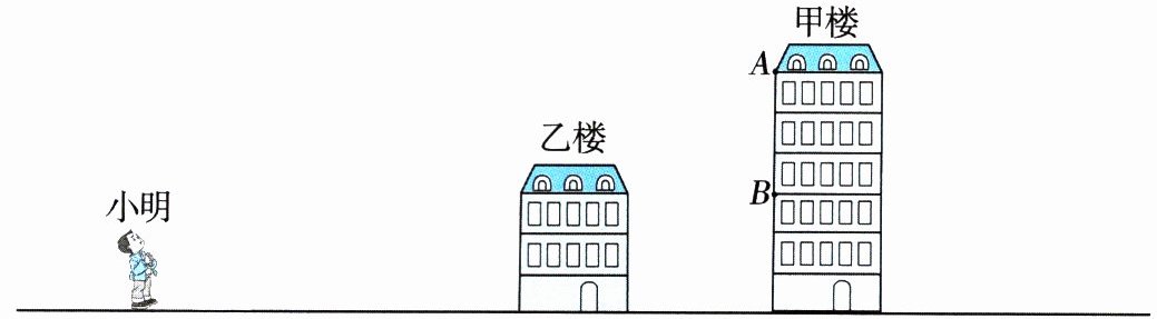 2. 小明能看到甲楼上的 $ A $ 点吗?能看到甲楼上的 $ B $ 点吗?请你想一想,画一画。