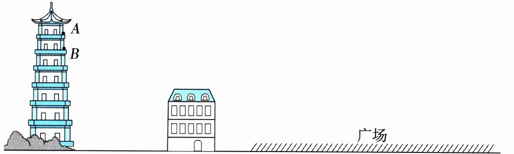 由于塔上 $A$、$B$ 两处高度不同,向远处广场眺望时,视线会被塔基附近的障碍物阻挡。