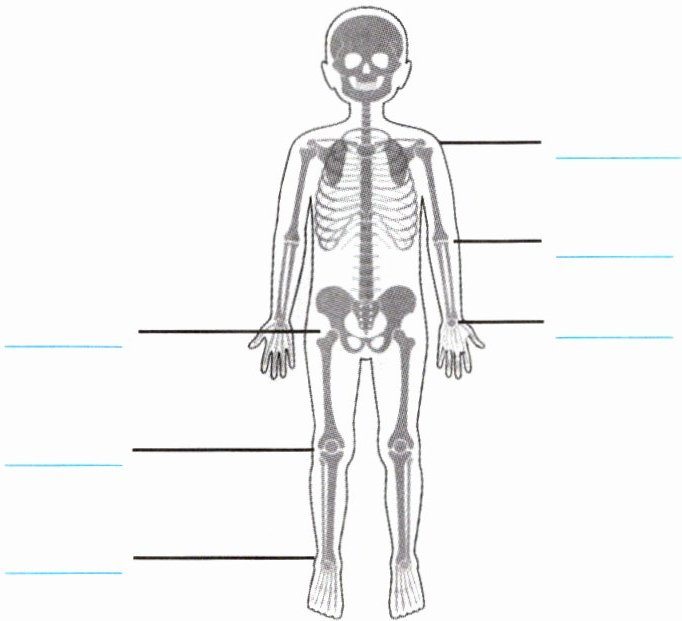(1)观察课本的“人体骨骼示意图”,并活动自己的关节。尝试在人体骨骼示意图中填写相应关节的序号:①肩关节、②肘关节、③腕关节、④髋关节、⑤膝关节、⑥踝关节。